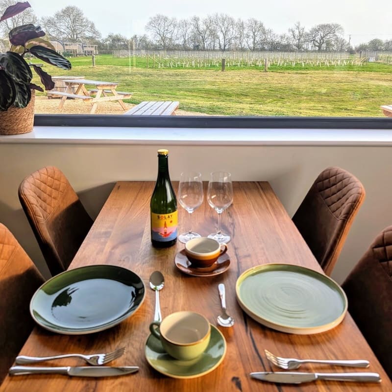 A brand new cafe that opened this week, sitting inside a working vineyard and cider orchard with panoramic views across the estate. Full breakfasts, sandwiches, cheese and charcuterie boards, and coffee from Stewart's Roasters. The full menu lands Friday 10th, afternoon tea from the same day, and the first Sunday roast is on the 12th.